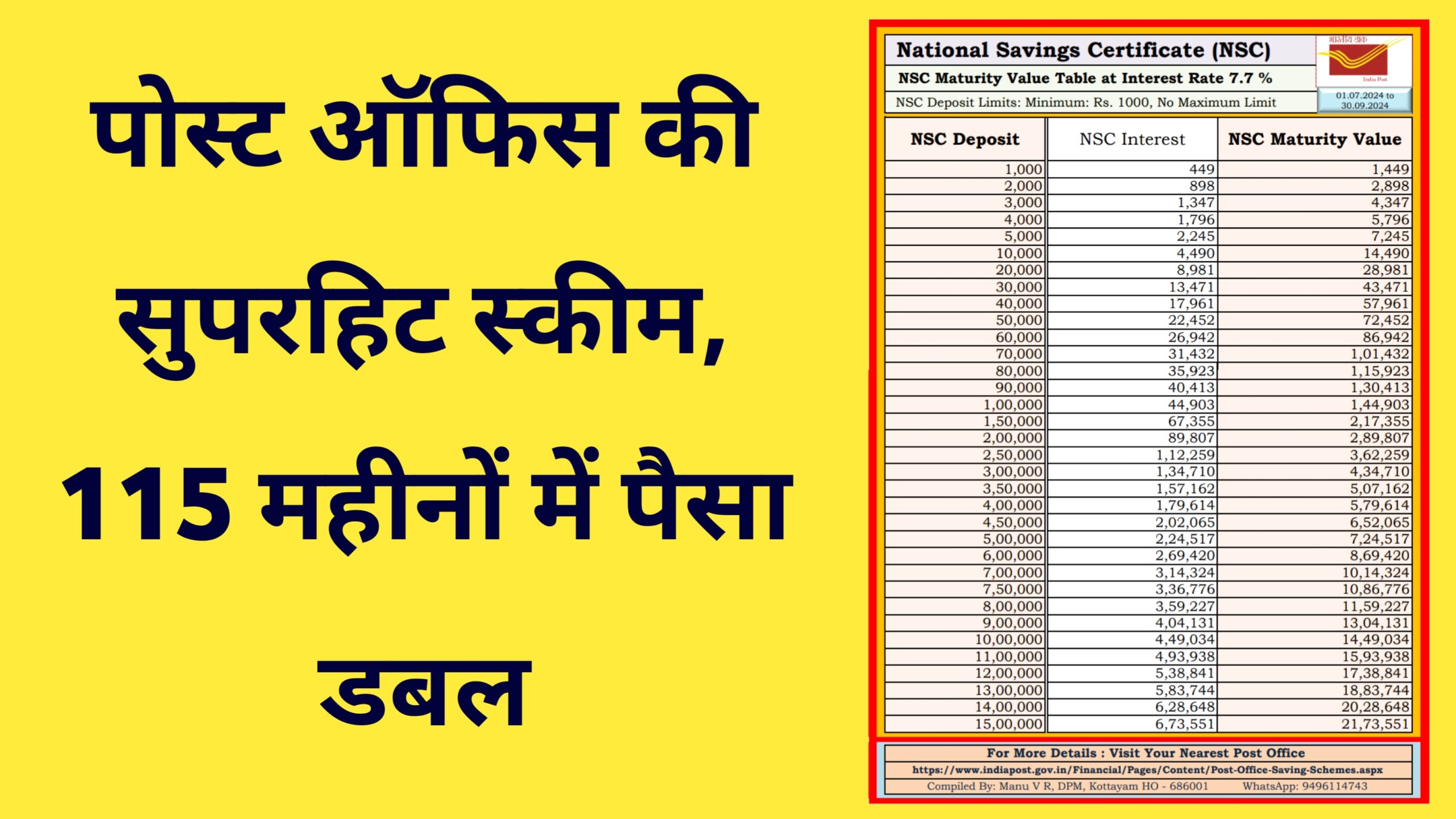 Post Office द्वारा समय- समय पर विभिन्न स्कीमें चलाई जाती हैं, जिनमें निवेश करना प्रायः सुरक्षित माना जाता है । ये स्कीमें लोगों के बीच में लोकप्रिय होती हैं और इनमें लोग निवेश करना भी पसंद करते हैं. आज हम इसी प्रकार की एक स्कीम के बारे में आपको बताने वाले हैं । इस स्कीम का नाम किसान विकास पात्र ( KVP ) है, यह स्कीम आपका पैसा डबल कर देती है । इस स्कीम के अंतर्गत 7.5% ब्याज प्रति वर्ष दिया जाएगा । यह एक एकमुश्त योजना है, जिसमें तिमाही व्याज डिवाइज्ड होता है । इस योजना में एक निश्चित अवधि के बाद आपका पैसा डबल हो जाता है ।